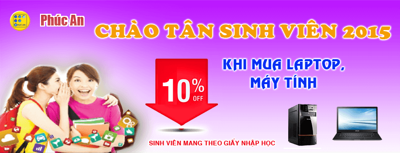 Công ty TNHH Công nghệ và Thương mại Phúc An - đơn vị chuyên cung cấp thiết bị máy văn phòng uy tín hàng đầu tại Hà Nội. Với mong muốn được góp phần nhỏ bé tạo nên tương lai tươi đẹp cho đất nước Viêt Nam. Phúc An với chương trình khuyến mại "Chào tân sinh viên 2015" - giảm giá 10% áp dụng cho các bạn tân sinh viên khi mua Laptop, Máy tính bàn tại Phúc An.